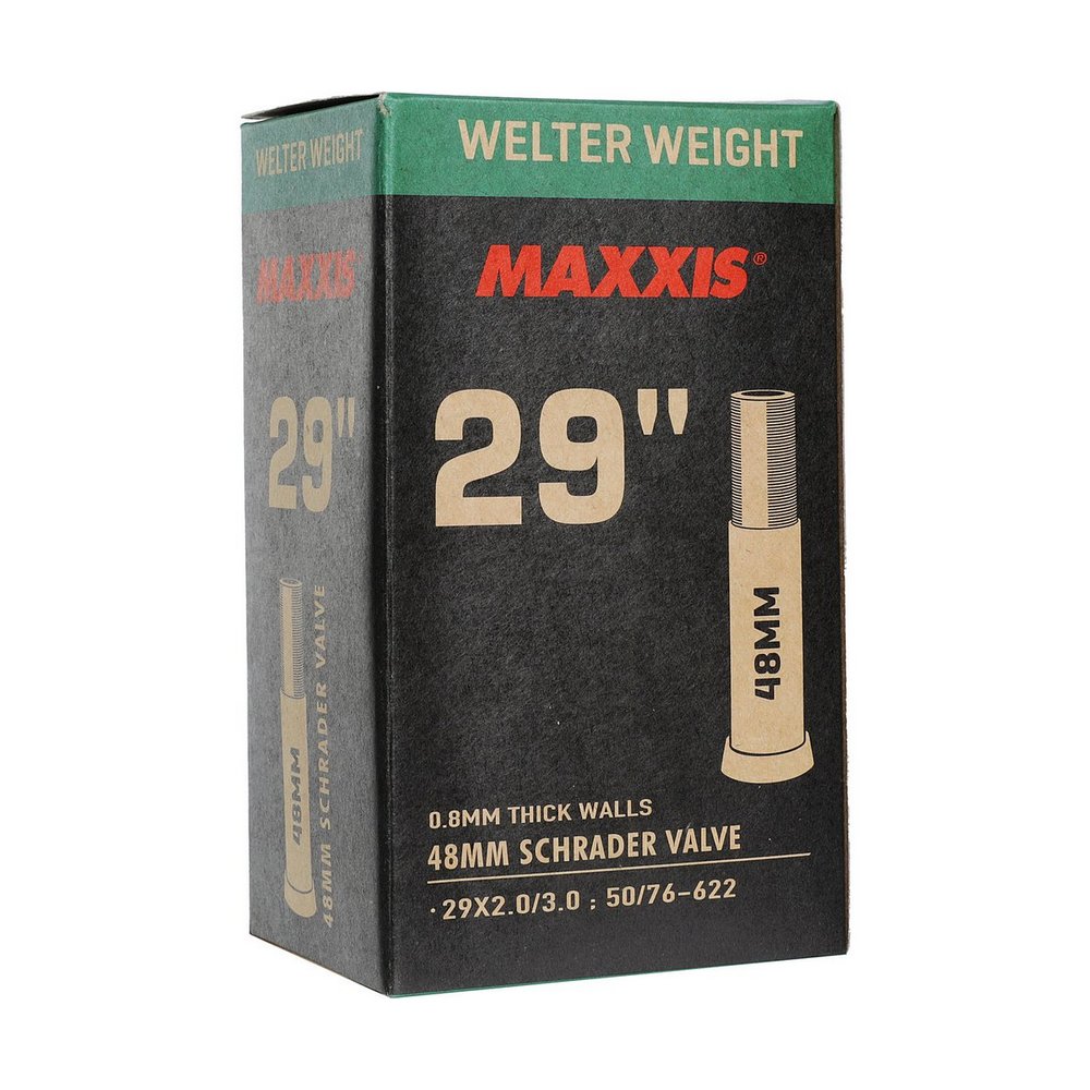 Велокамера Maxxis WelterWeight для покрышек 29" имеет толщину стенки 0.8 мм, что сохраняет баланс между прочностью и весом. Это самая распространенная у велосипедистов модель.