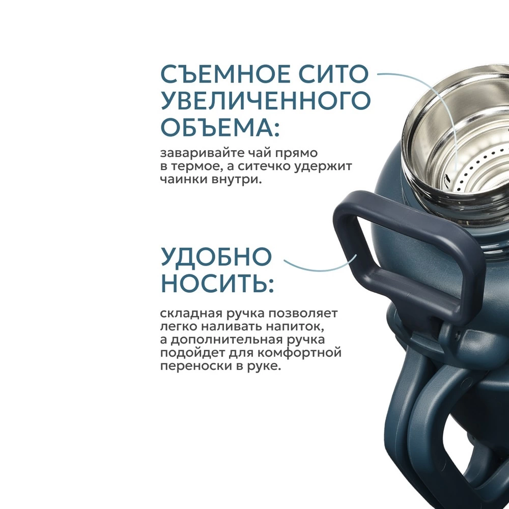 Термос с увеличенным ситечком и двумя чашками — идеальный спутник для длительных путешествий, пикников и активного отдыха. Благодаря объему 1.9 л и продуманной конструкции он надолго сохранит ваши любимые напитки горячими или освежающе холодными. Встроенное увеличенное ситечко позволяет заваривать чай, кофе или травяные сборы прямо внутри термоса, а две удобные ручки обеспечивают комфортную переноску и розлив. Модель выполнена из высококачественной пищевой нержавеющей стали, что гарантирует долговечность и гигиеничность.