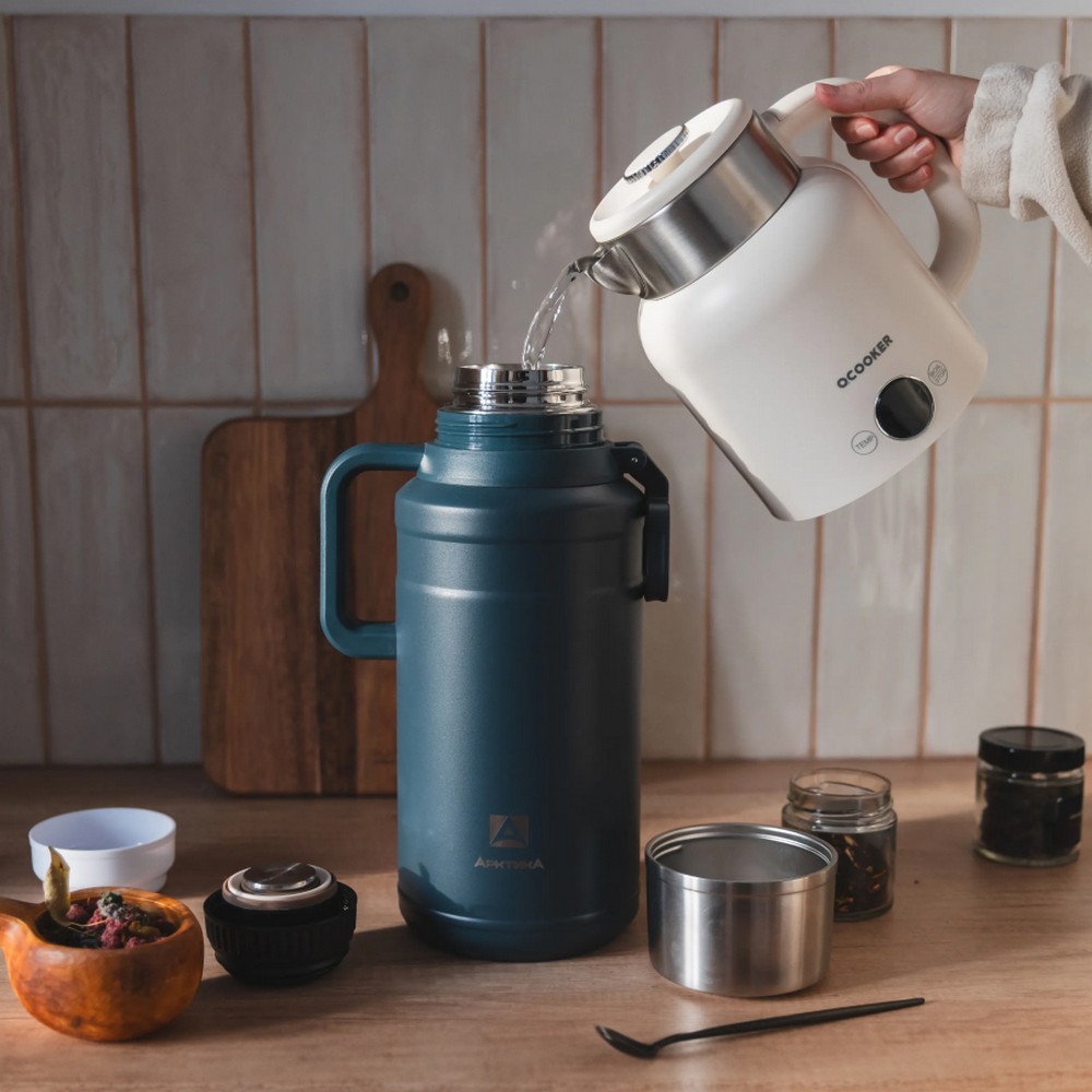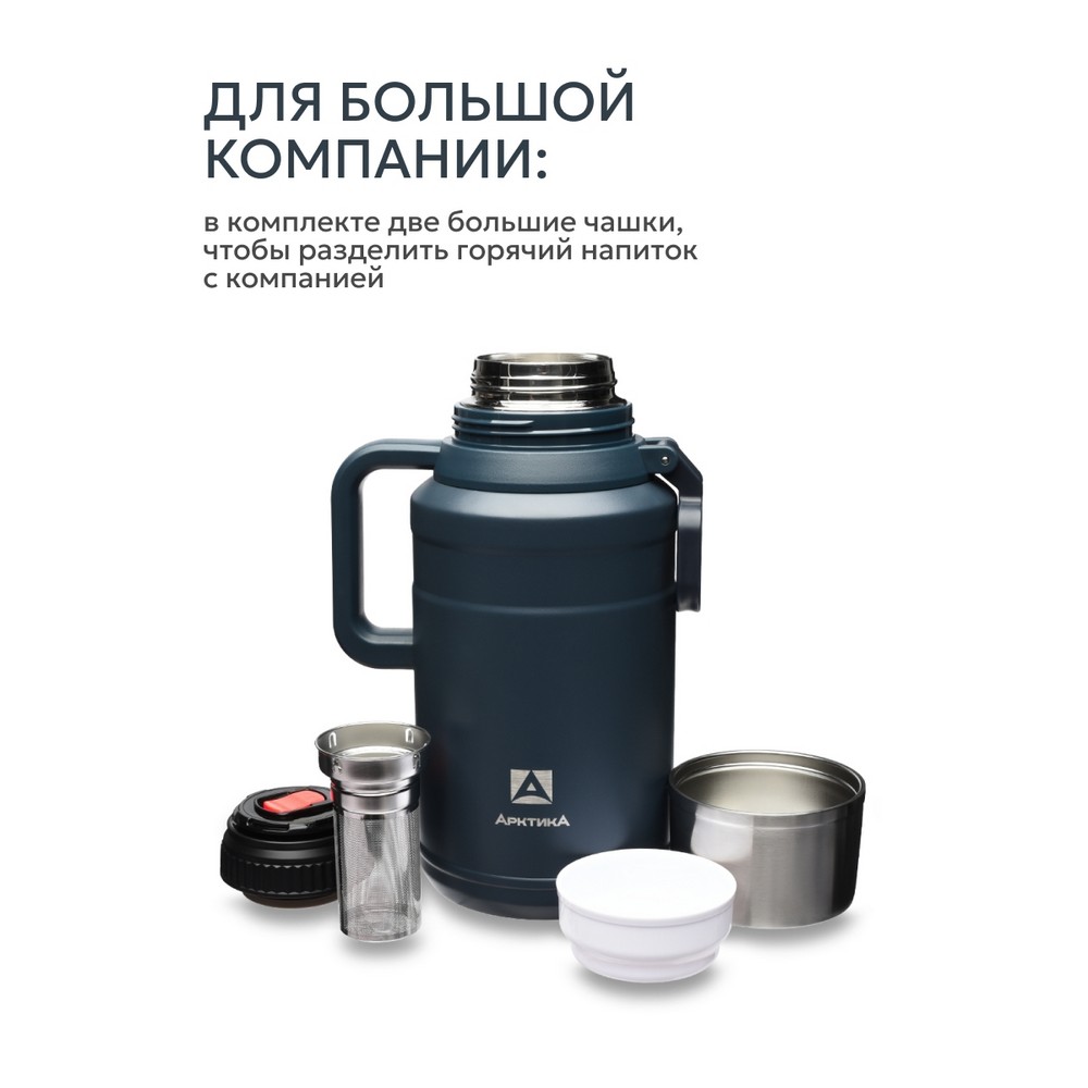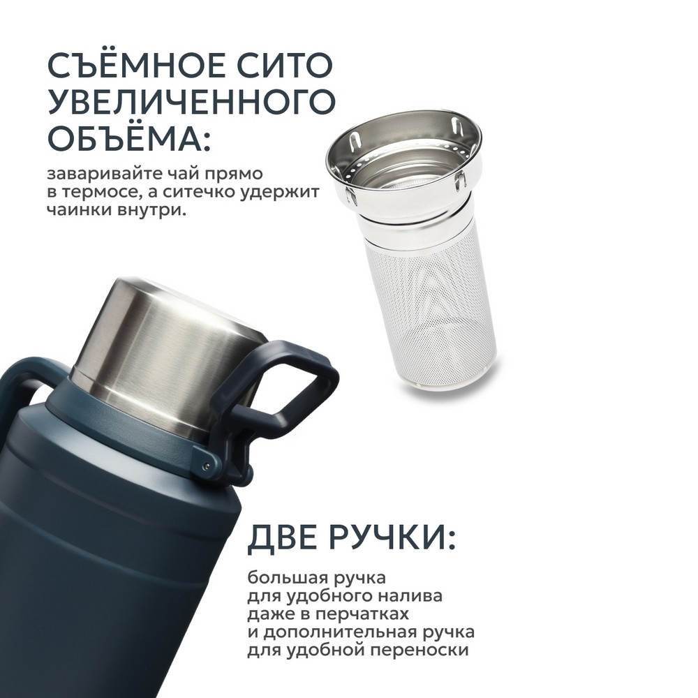 Термос с увеличенным ситечком и двумя чашками — идеальный выбор для длительных поездок и отдыха на природе. Объем модели составляет 3 литра. Термос оснащен увеличенным съемным ситечком — теперь можно заваривать любимые напитки прямо внутри: крупнолистовой чай, молотый кофе, ягоды и дольки цитрусовых останутся в сите, а вы получите чистый насыщенный напиток без осадка. Продуманная конструкция включает две удобные ручки: крепкая боковая ручка облегчает подъем и наклон тяжелого термоса при розливе, а верхняя ручка предназначена для комфортной переноски. В комплекте идут две чашки, которые компактно складываются друг в друга и не гремят во время транспортировки. Основная чашка с двойными стенками полностью выполнена из стали — она не обжигает ладони с горячим напитком и сохраняет температуру. Корпус термоса изготовлен из высококачественной пищевой нержавеющей стали, обеспечивающей долговечность и надежную вакуумную изоляцию. Глухая пробка с термоизолятором и каналами для наливания в полуоткрытом положении позволяет легко разливать напитки, не откручивая крышку полностью. Благодаря вакуумной изоляции термос сохраняет тепло до 60 часов и холод до 117 часов, что подтверждает его высокую эффективность.
