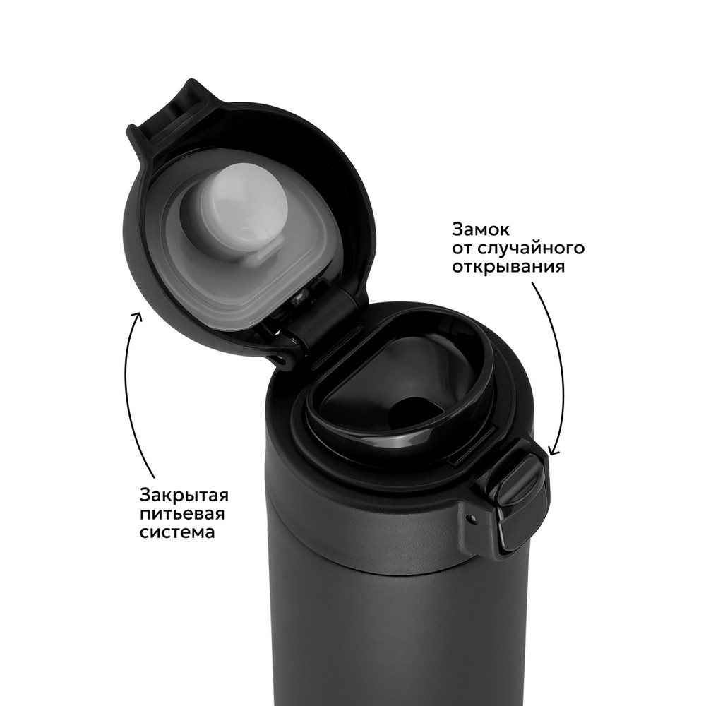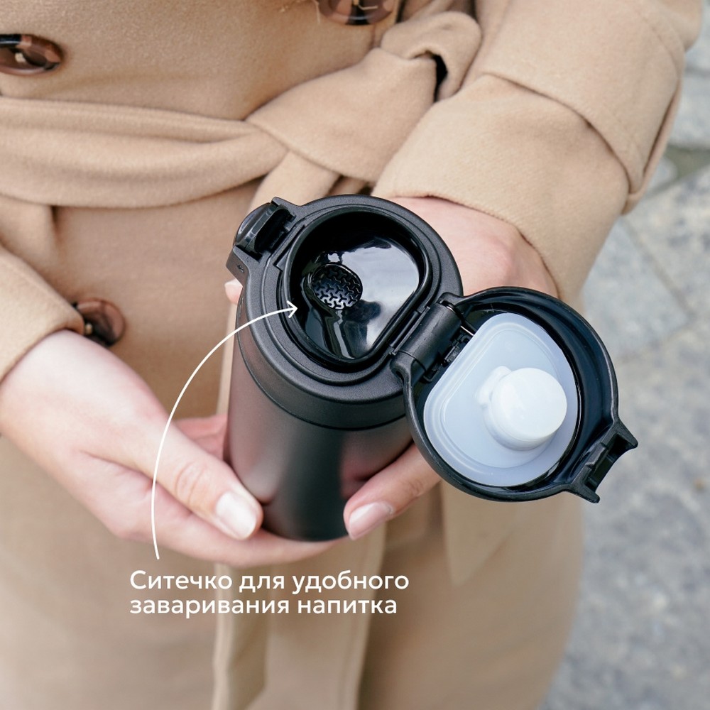 Одна из самых комфортных термокружек для использования на ходу и налегке, благодаря широкому питьевому носику и откидной крышке с фиксирующим замком. Гипоаллергенная силиконовая прокладка гарантирует герметичность и защиту, а встроенное в крышку ситечко оставит крупную заварку внутри.