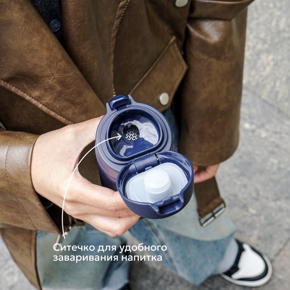 Одна из самых комфортных термокружек для использования на ходу и налегке, благодаря широкому питьевому носику и откидной крышке с фиксирующим замком. Гипоаллергенная силиконовая прокладка гарантирует герметичность и защиту, а встроенное в крышку ситечко оставит крупную заварку внутри.
