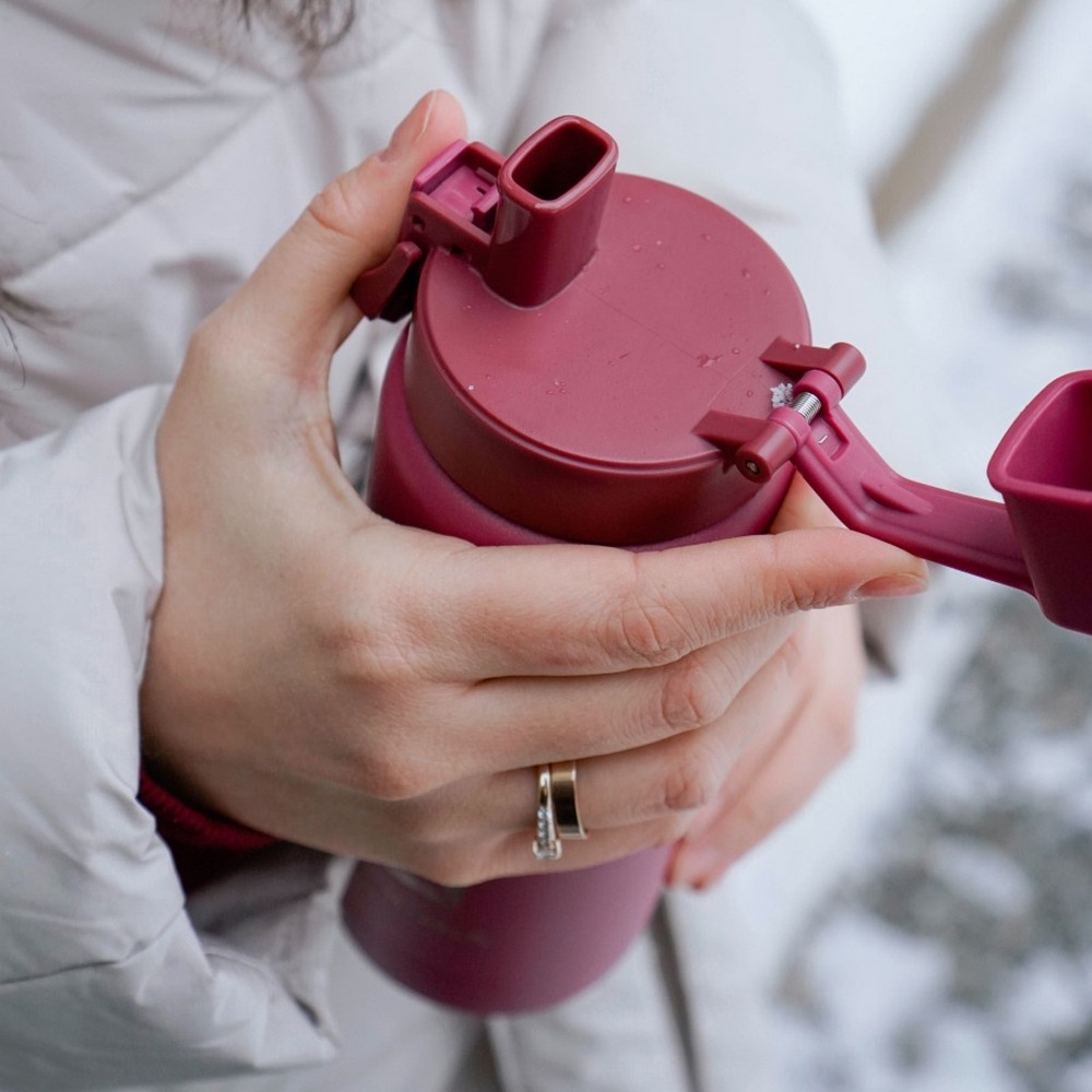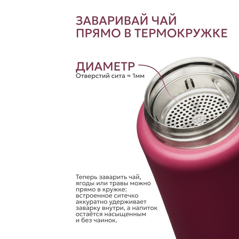 Термокружка для спорта и активного отдыха — идеальное решение для тех, кто ценит мобильность и всегда хочет иметь под рукой любимый напиток. Компактная форма повторяет силуэт спортивной бутылки: она удобно лежит в руке, помещается в подстаканник автомобиля и рюкзак. Благодаря надежному замку от случайного проливания можно смело брать кружку в дорогу, тренировку или поход — напиток останется внутри даже при активном движении. Встроенное съемное ситечко позволяет заваривать чай, кофе или травяные сборы прямо в кружке: крупная заварка, ягоды и дольки цитрусовых останутся в сите, а вы получите чистый насыщенный вкус без осадка. Откидывающаяся крышка выполняет функцию удобной ручки для переноски — простое и надежное решение, когда под рукой нет чехла или подстаканника. Термокружка изготовлена из высококачественной пищевой нержавеющей стали, которая обеспечивает надежную вакуумную изоляцию. Благодаря этому напитки остаются горячими до 8 часов и холодными до 20 часов. Компактные размеры и легкий вес (всего 260 г) делают модель незаменимым спутником для активного образа жизни.