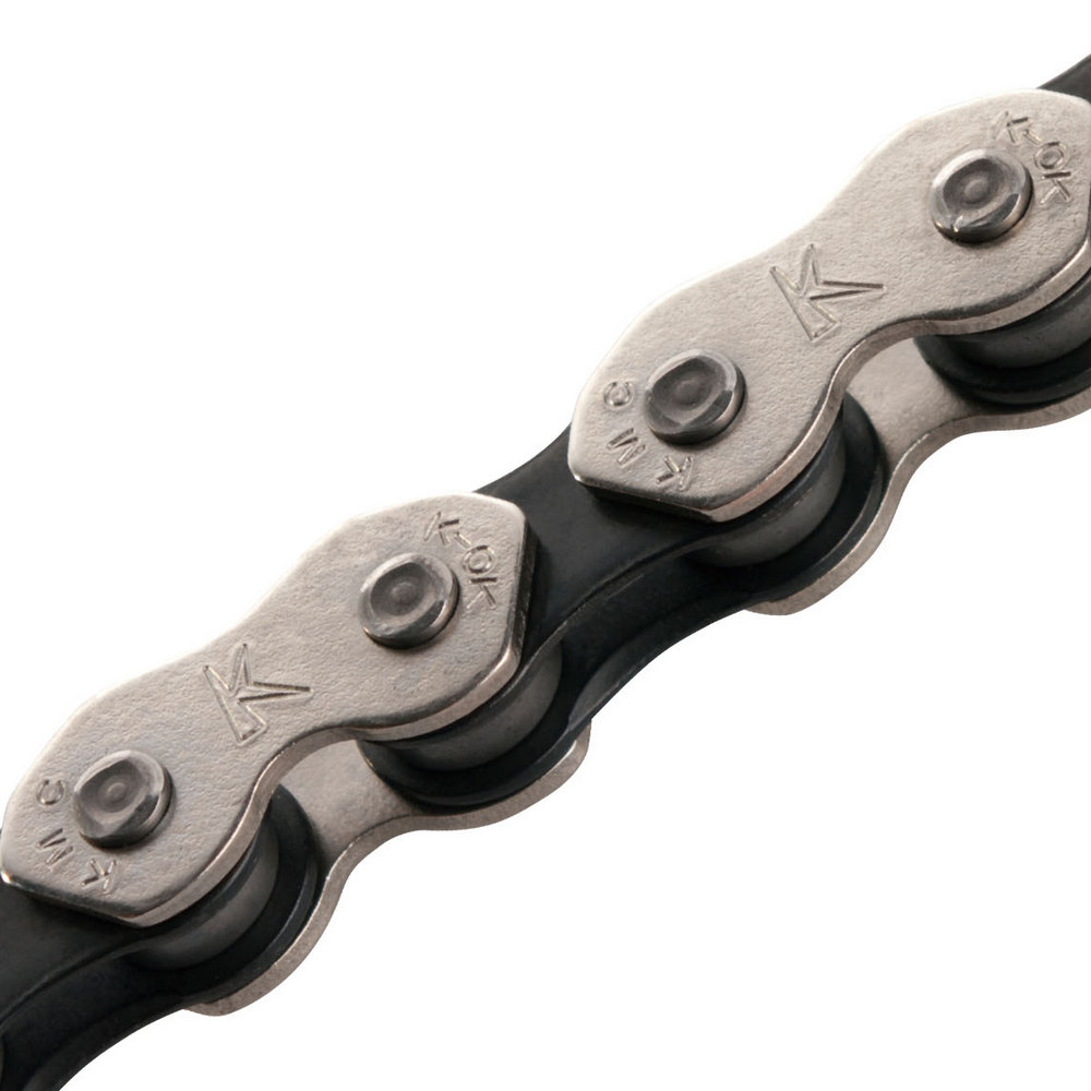Цепь KMC K1 WIDE, 1/2х1/8", 9,4мм, 1-скоростная BMX/FREESTYLE, предел прочности на разрыв - 1300кг, специальный дизайн препятствует соскальзыванию цепи с зубьев, 110 звеньев, c замком, серебристо-черная, в коробке